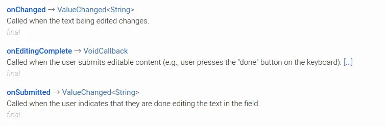其实对于一个输入框,我们最关心的无非就是监听输入的内容,然后输入完成后,输入框中的内容是什么,文档中写的很清楚,textfiled控件有三个回调函数