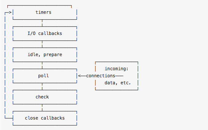 外部输入数据—>poll阶段—>检查阶段(check)—>关闭事件回调阶段(close callback)—>定时器检测执行阶段(timers)—>I/O事件回调阶段(I/O callbacks)—>idle,prepare—>poll…
