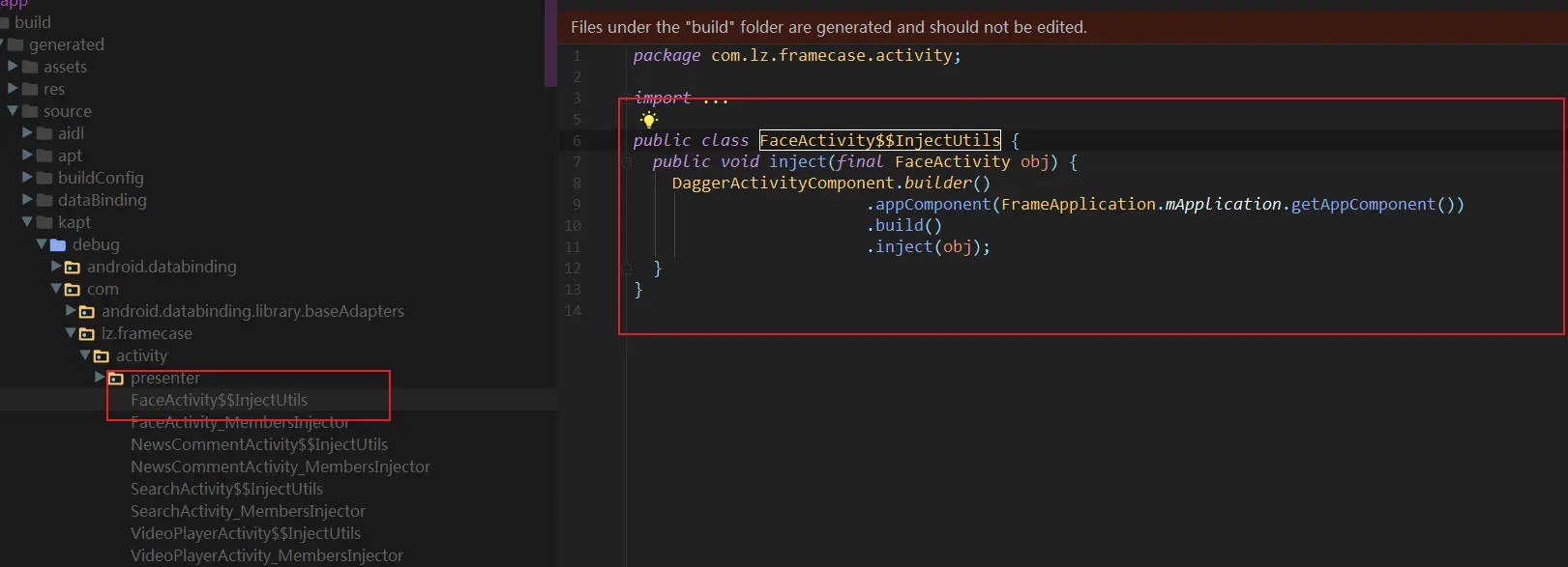 @InjectActivity : 这个是替代initInject方法的 通过apt技术编译时生成不同的initInject方法的class,然后在BaseActivity里使用反射将当前class绑定到Component中 编译生成的class