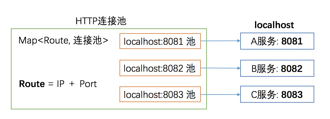 利用上图辅助理解,由于Http Client 可能会调用多个服务,因此它对不同的服务(就是IP+Port)有独立的连接池,这些独立连接池的并集就是 Http Client 的连接池概念。