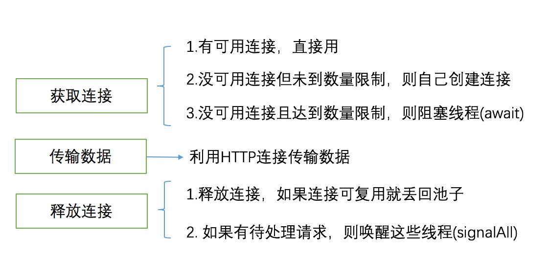 如果有现成的连接,就直接用;如果没有且没有达到连接数量限制,就创建新连接用;如果连接池满了,那就把当前请求对应的线程给阻塞住,并加到pending列表中,等到有连接可用时再来唤醒它。