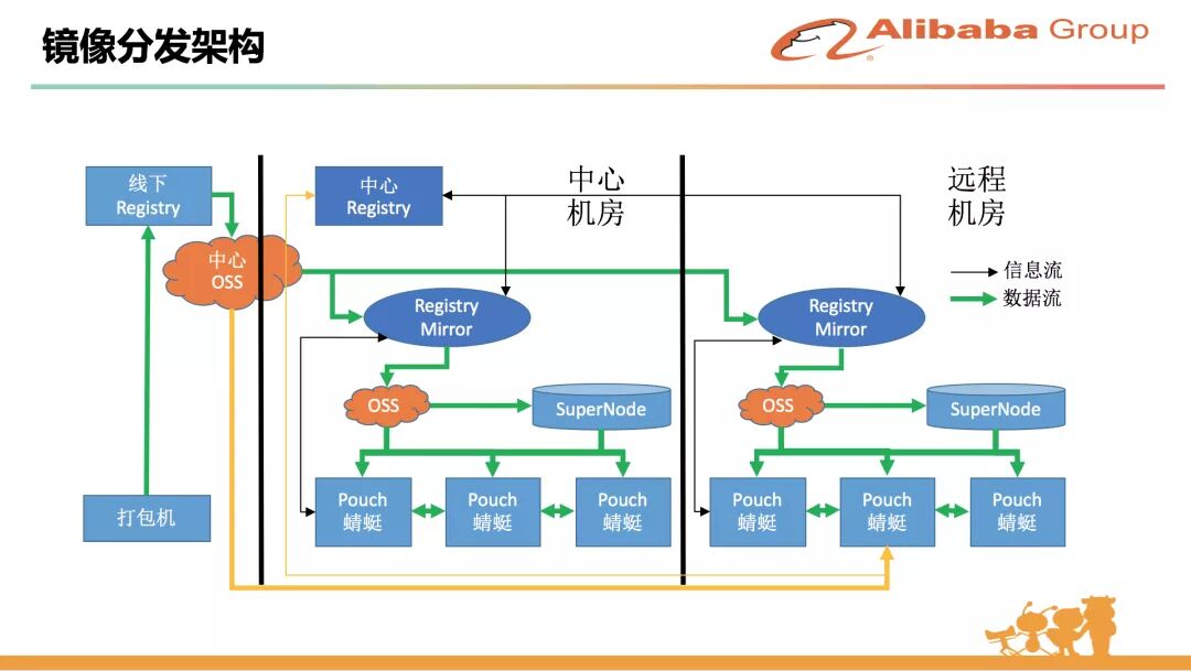 这是 PouchContainer 的镜像分发设计。我们内部有很多比较核心的应用,体量比较大,实例会分布在上万台物理机上。发布新版本的时候上万台机器同时拉镜像,任何中心的镜像仓库都扛不住。因此我们设计了一套镜像分发的二级架构,在每个地域建一个 mirror,在同一个地域内拉镜像的时候用 P2P 分发技术---我们内部的产品名叫蜻蜓,已经开源;需要拉镜像的服务器之间可以分散互相拉文件片段,这样就直接化解了中心镜像仓库的服务压力和网络压力。