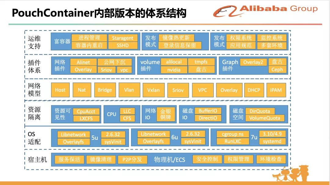 这是 PouchContainer 内部版本的体系结构。在最底层的宿主机层面,我们会做一些管理和运维,目的是为了确保容器运行依赖的基础环境是健康的,包括宿主机的一些镜像清理,包括安全控制、权限管理等。OS 的低版本内核我们是适配到最低 2.6.32 内核,包括容器里面的进程管理也做了很多的适配。资源隔离前面讲过了,网络模型我们内部其实主体用的是 Bridge,但是其他各种各样的场景也都支持。