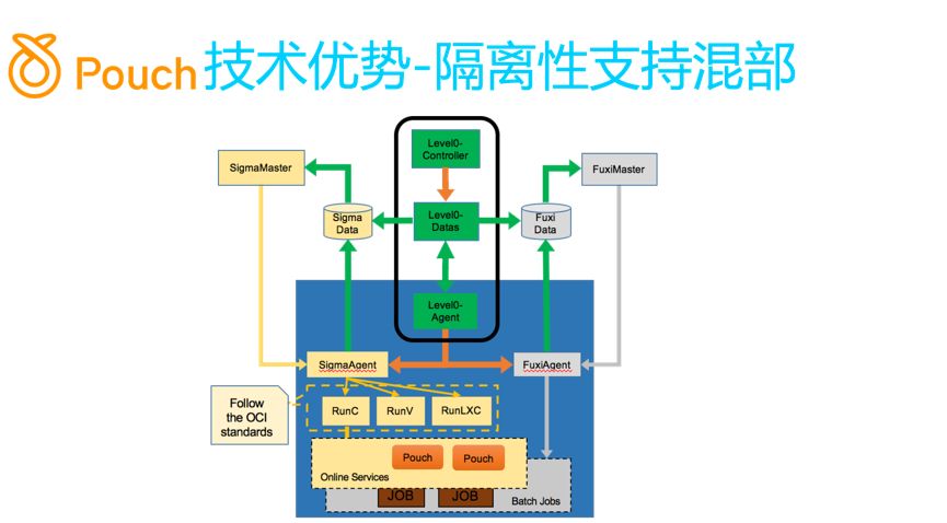 Q: 我想问一下 PouchContainer 这个容器跟底层还会去封装 Docker 之类的东西,我第一次接触这个,另外镜像库的话是能够跟 Docker 兼容吗?
