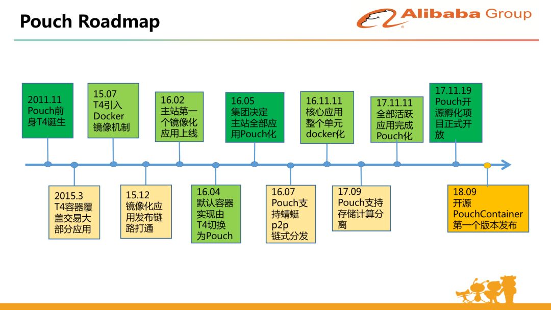 上面是 PouchContainer 容器的 Roadmap, 2011 年的时候 T4上线 ,到 2015 年 3 月的T4 覆盖了交易的大部分应用。这个时候开始引入了 Docker 镜像机制,这里面做了很多兼容性的工作。