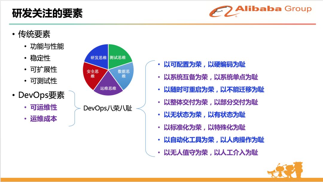 为了更好的把自己的系统建设好,我们要倡导研发从第一天建立系统的时候,就要考量最终的可运维性,比如参数是否可配置,是否可以随时重启。机器每天都有硬件故障产生,这些硬故障不可能每天都人工处理,必须要尽可能自动化处理,自动化处理时,虽然有些故障只影响了一部分实例,另一部分是好的,但是也可能需要一起处理,比如需要物理机上的业务全部迁移走来维修物理机的时候。所以不管当时容器里的业务是好的还是不好的,都要满足随时可重启,可迁移的要求。原来是部分交付,现在要考虑你到底运行环境是什么样的,什么样的运行环境才能跑起来,尽量做标准化的操作。