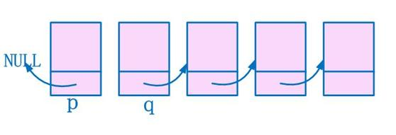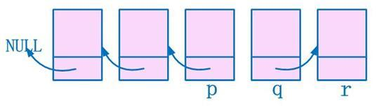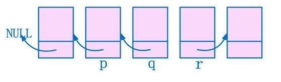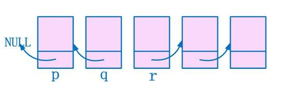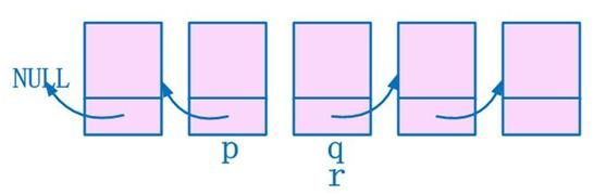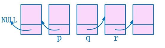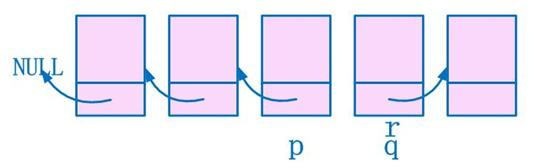 使用p和q两个指针配合工作,使得两个节点间的指向反向,同时用r记录剩下的链表。