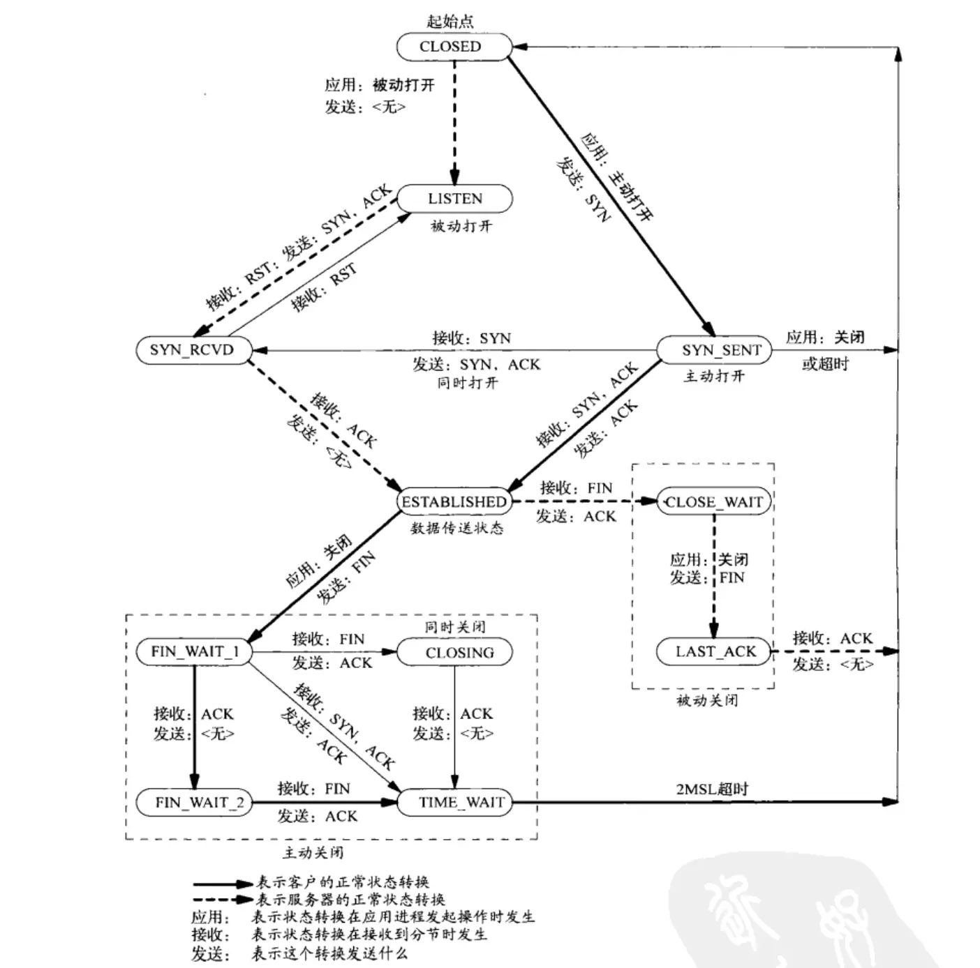 先来看看下面这张图,是UNIX网络编程中,TCP状态变化的经典流程图:
