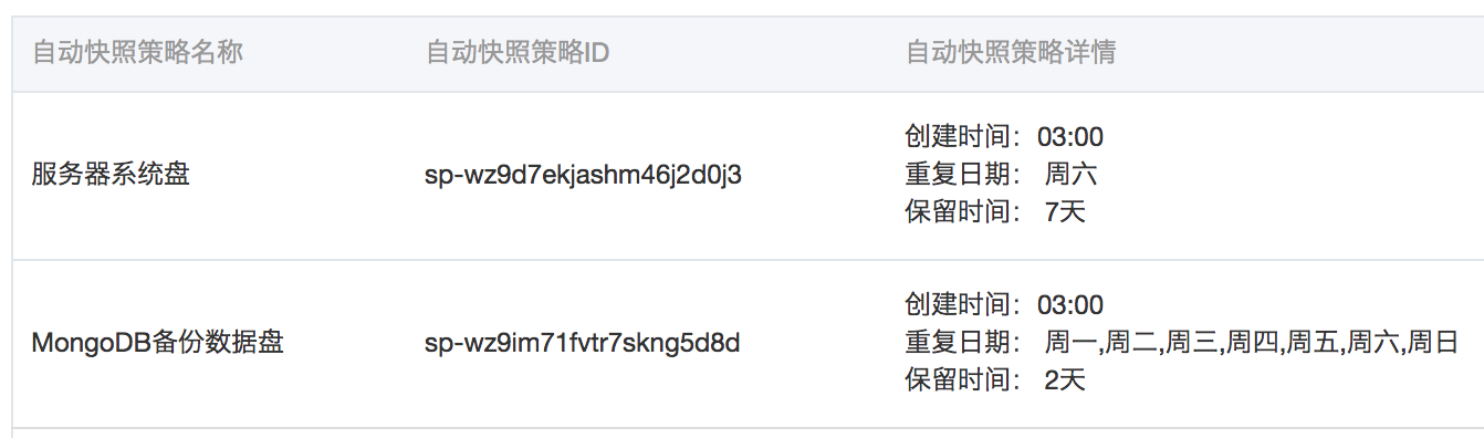 我只是将mongodump导出的核心数据所在磁盘进行了快照。每天快照1次,保存两天。这样做可以确保核心数据的安全性。