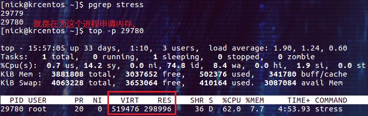 下面的 stress 命令会创建一个进程并通过 malloc 函数分配内存: