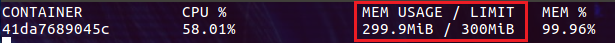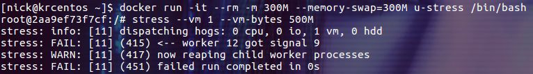 $ docker run -it --rm -m 300M --memory-swap=300M u-stress /bin/bash