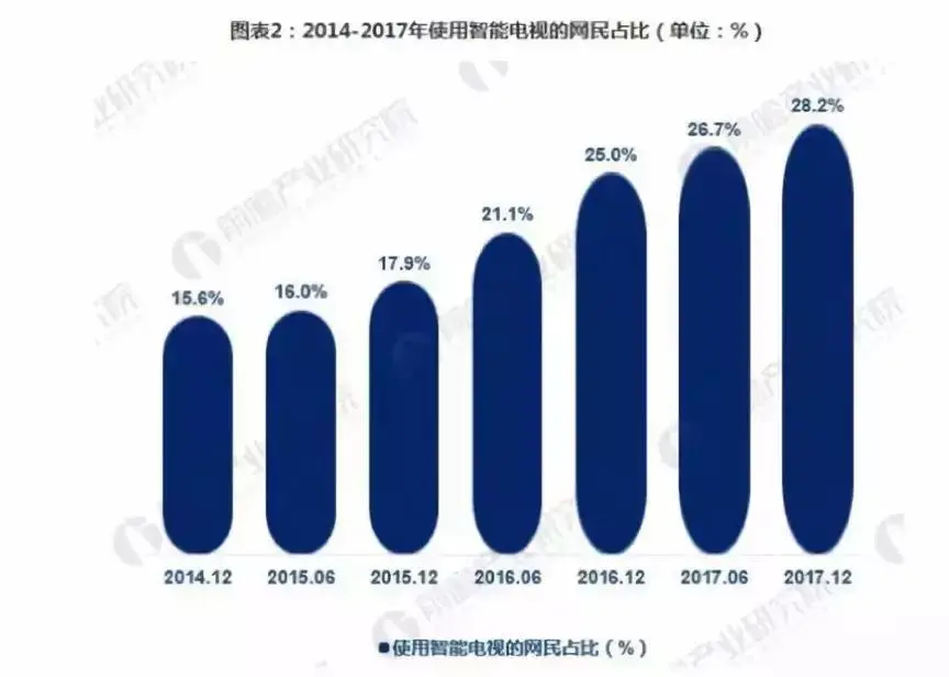 另外,中国互联网络信息中心的监测数据也显示,近年来使用智能电视的网民占比逐步提高:从2014年的15.6%提升至了2017年的28.2%,三年时间提升了接近13个百分点。