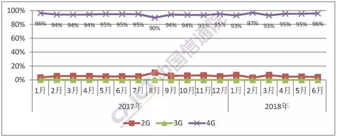 来自中国信息通信研究院发布的《2018年6月国内手机市场运行分析报告》显示,今年上半年国内手机市场出货量为1.96亿部,同比下降17.8%。4G手机上半年出货量1.86亿部,同比下降17.9%。3G手机出货量3.4万部,同比下降93.2%。2G手机出货量1024.8万部,同比下降13.4%。4G手机已经成为市场主流,2G、3G手机颓势明显。