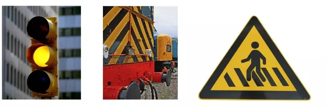 黄色是一个高可见的色彩,这个高可见是明显引人注目的,因此它常常被用于健康和安全设备以及危险信号中。交通标示、安全岛的涂色、减速板、警告标线、火车涂装等等皆多采用黄色(与黑色相间)来提醒人们的注意力。