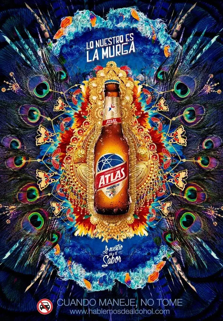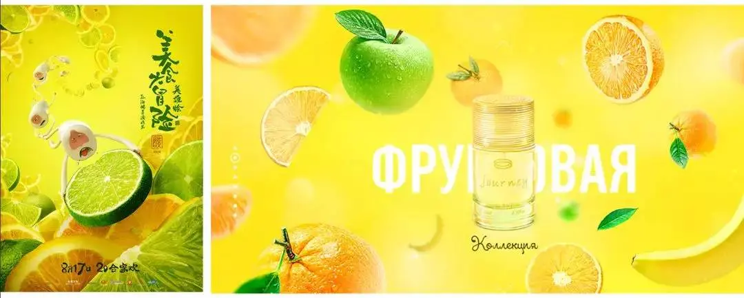 左边这个饮料是蓝色的,所以广告选择了蓝色主题,为了创造活跃的气氛,设计师选择了柠檬黄的字体+动感的人物素材,一下子就活力十足了。