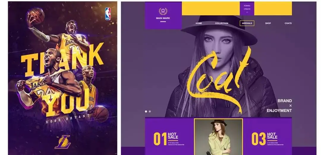 紫金,高贵、神秘的配色方案,刚刚说了,黄色和活泼,紫色很安静,那么如果紫色占据大面积的时候,黄色必然非常非常跳! 很适合做一些需要强力突出主题的设计。