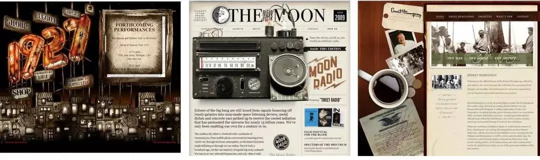 暗淡的褐色在视觉上给人传递出颓废、消沉的情绪,不太适合用在积极的主题上,但它却非常适合营造工业化、复古的氛围,配合纹理、材质的使用,可以给人饱经岁月打磨的厚重感。