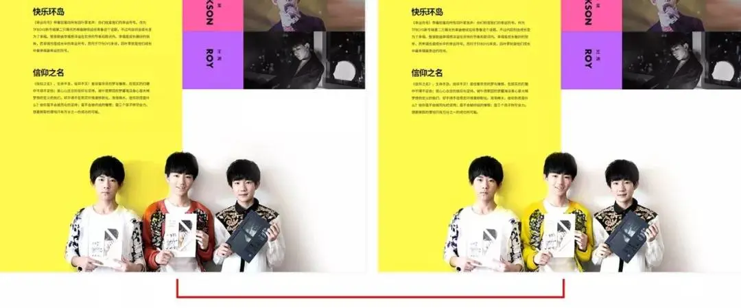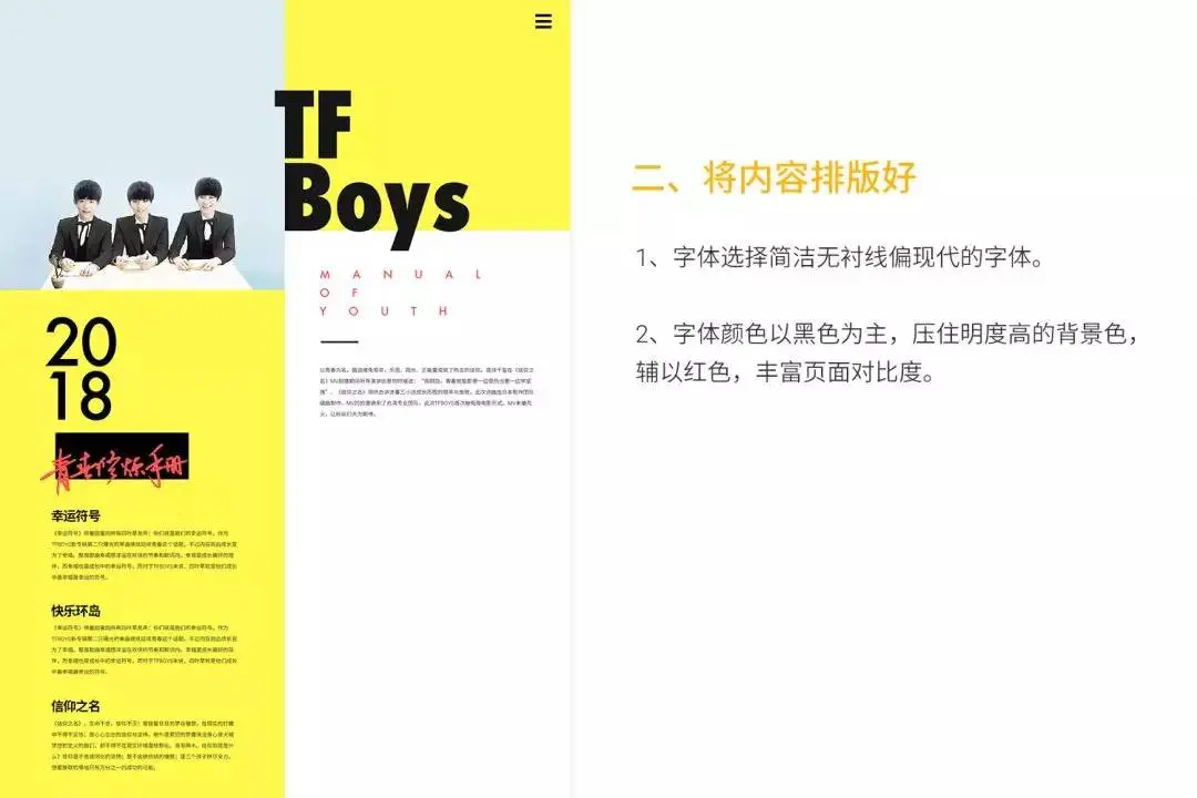 1、选择明黄色为主色调,能很好的体现TFBOYS青春、阳光、正能量的形象气质。