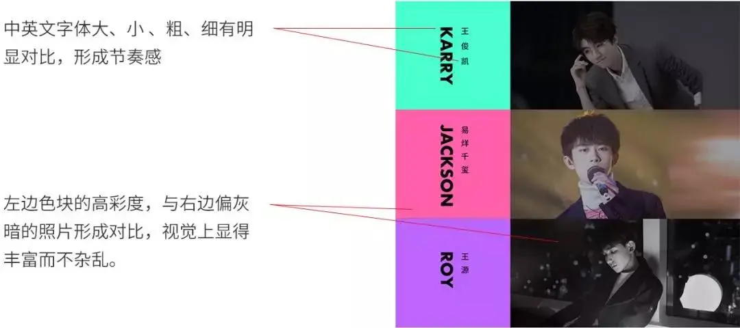 左边色块的高彩度,与右边偏灰暗的照片形成对比,视觉上显得丰富而不杂乱。