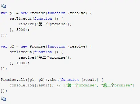 all接收一个数组作为参数,p1,p2是并行执行的,等两个都执行完了,才会进入到then,all会把所有的结果放到一个数组中返回,所以我们打印出我们的结果为一个数组。