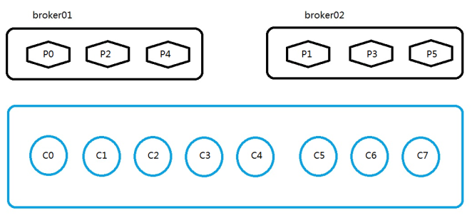 但是partition只有P0-P5根本就没有P6和P7,所以这两个消费者相当于是会被闲置的,就相当于占用资源,却没什么用,所以在这里真正起到作用的就是C0-C5。
