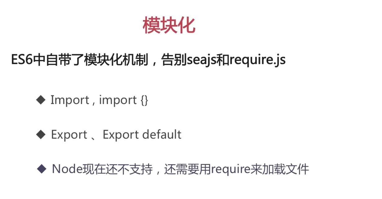 - import是解构过程,但是目前所有的引擎都还没有实现import,我们在node中使用babel支持ES6,也仅仅是将ES6转码为ES5再执行,import语法会被转码为require