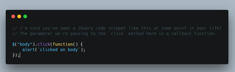 这是函数式编程非常有用的功能,因为回调让我们异步处理代码,而不必等待响应。例如,您可以使用回调函数对慢速服务器进行ajax调用。并完全忘记它并继续你剩下的代码。一旦该ajax调用得到解决,回调函数就会自动执行。