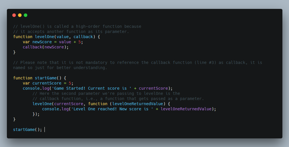 既然不会阻止主线程,这意味着我们可以执行所有类型的操作,例如从API获取数据,进行一些数学运算等,所有这些都是耗时的。一旦function(levelOne())完成了它的操作,它就可以执行我们之前传递的回调函数。