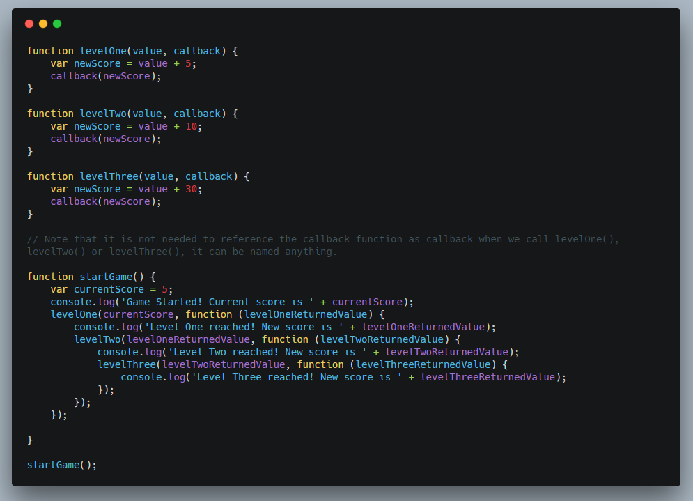 但是如果要在嵌套多级回调,回调可能会变得很糟糕。让我们以上面的例子为游戏添加更多关卡。