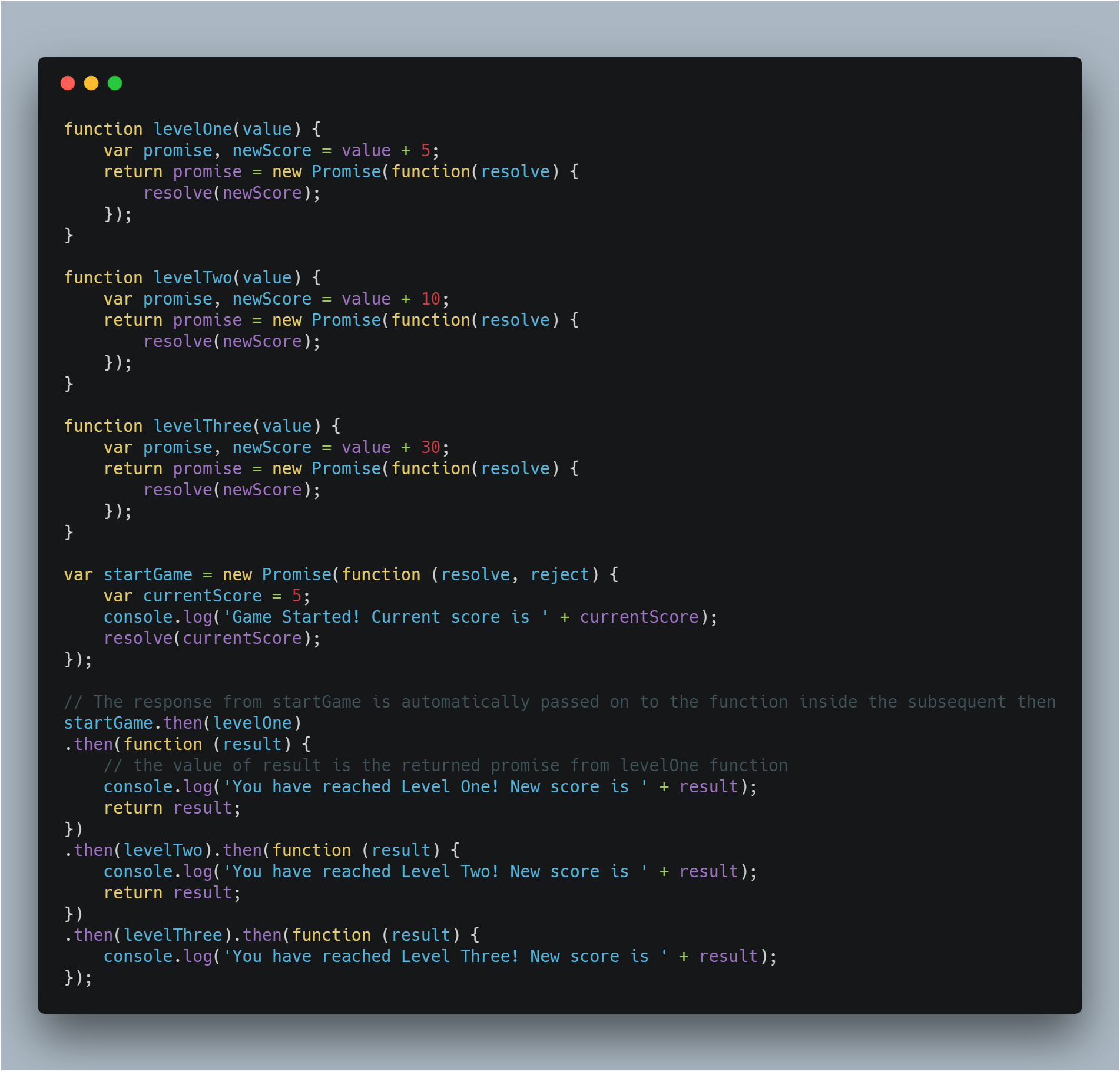 level增加了两个新的功能,levelTwo()和levelThree()。在levelOne的内部回调(第22行)中,通过回调函数和levelOne的回调结果调用levelTwo()函数。并再次为levelThree()函数重复相同的操作。