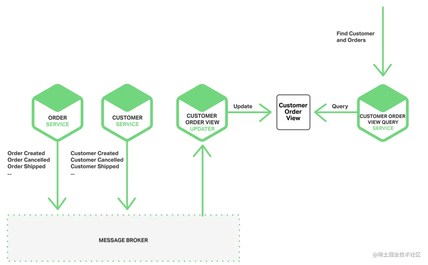 - 我们的查询任务往往很复杂,比如查询商品列表,要求按照上个月的销售额进行排序; 要按照商品的退货率排序等等。但是在微服务和DDD之后,我们的存储模型已经被拆离开,上述的查询都是要涉及订单、用户、商品多个领域的数据。如何搞? 此时我们要引入一个视图的概念。比如下面的,查询用户名下订单的操作,直接调用两个服务自己在内存中join效率无疑是很低的,再加上一些filter条件、分页,没法做了。于是我们将事件广播出去,由一个单独的视图服务来接收这些事件,并形成一个物化视图(materialized view),这些数据已经join过,处理过,放在一个单独的查询库中,等待查询,这是一个典型的以空间换时间的处理方式。