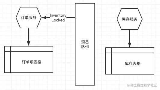 库存服务在接收到Order Created 事件后,将库存表格中的某sku减掉可销售库存,增加订单占用库存,然后再发送一个Inventory Locked事件给消息队列