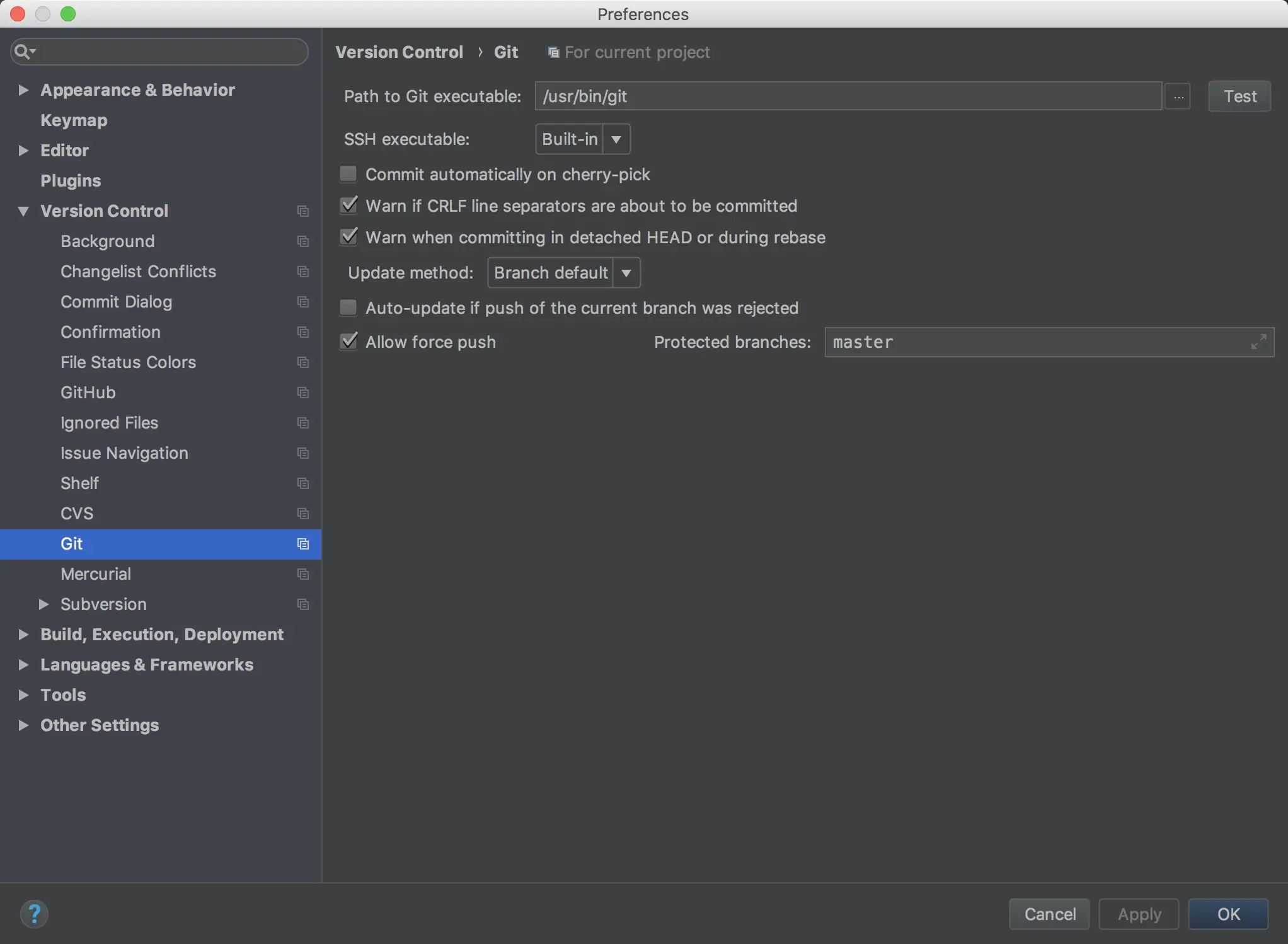 首先在AS上打开Preferences(command + ,),接着点击Version Control --> Git在Path To Git Executable上输入Git的存放位置,如下图: