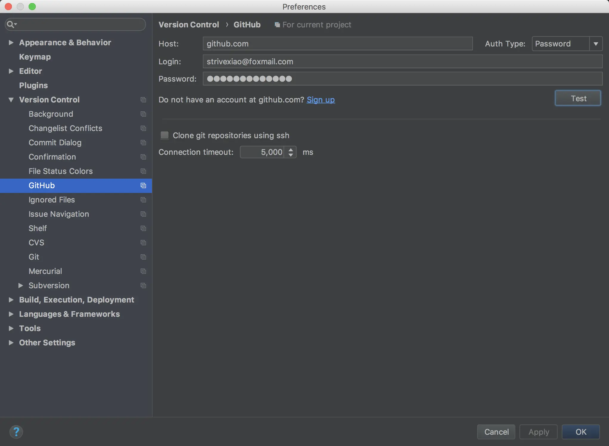 按照下图配置你的GitHub账号,输入完成之后再点击Test按钮,如果账号密码正确的话也会提示成功