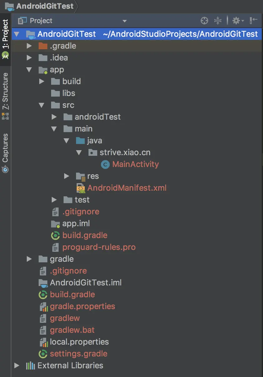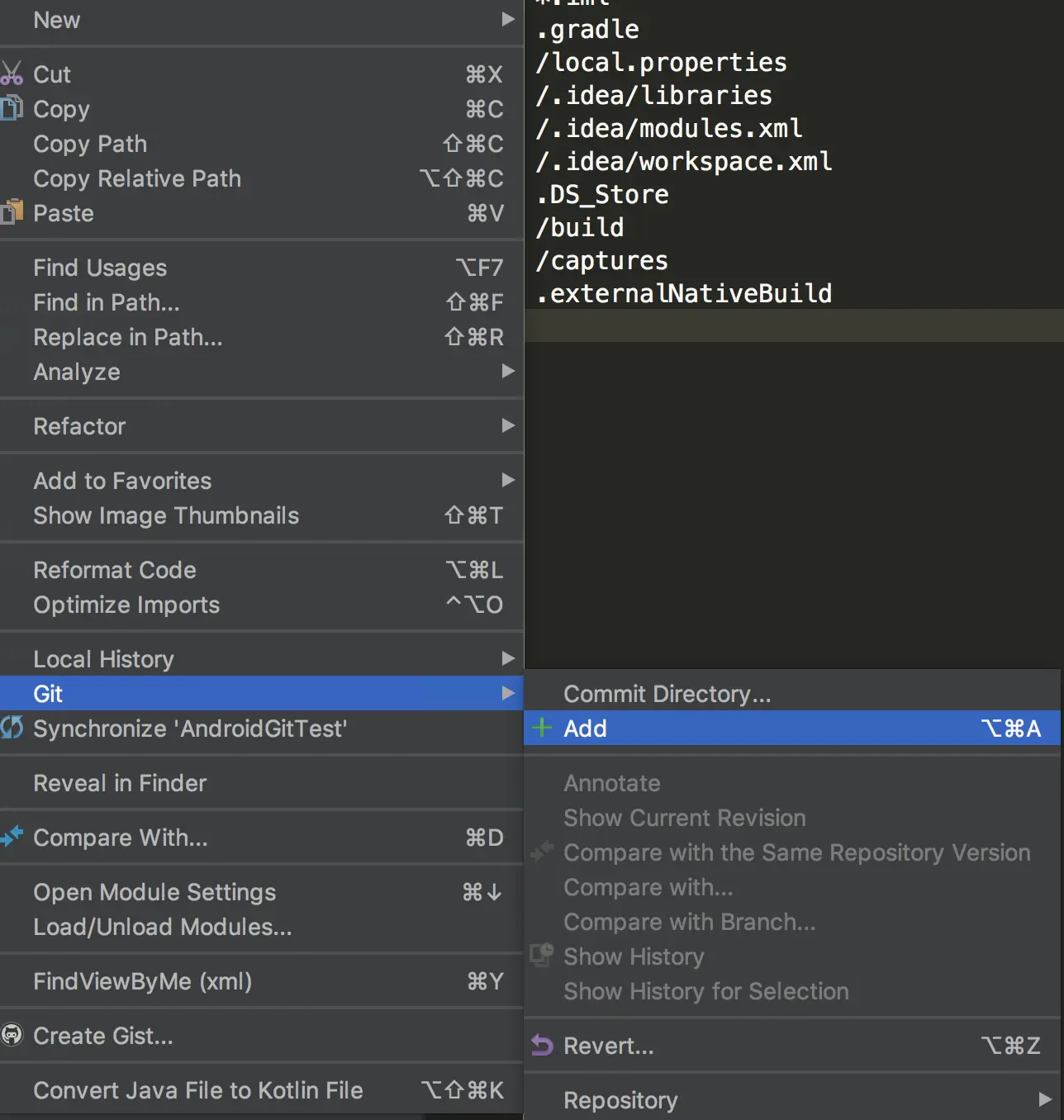 因为是新项目还没有将文件加入仓库,所以这些文件名才都是红色,我们可以使用Android Studio的add方式进行添加,有4种,咱们这里可以随便使用一种,比如选中项目的根目录,右键选中Git,再选择Add: