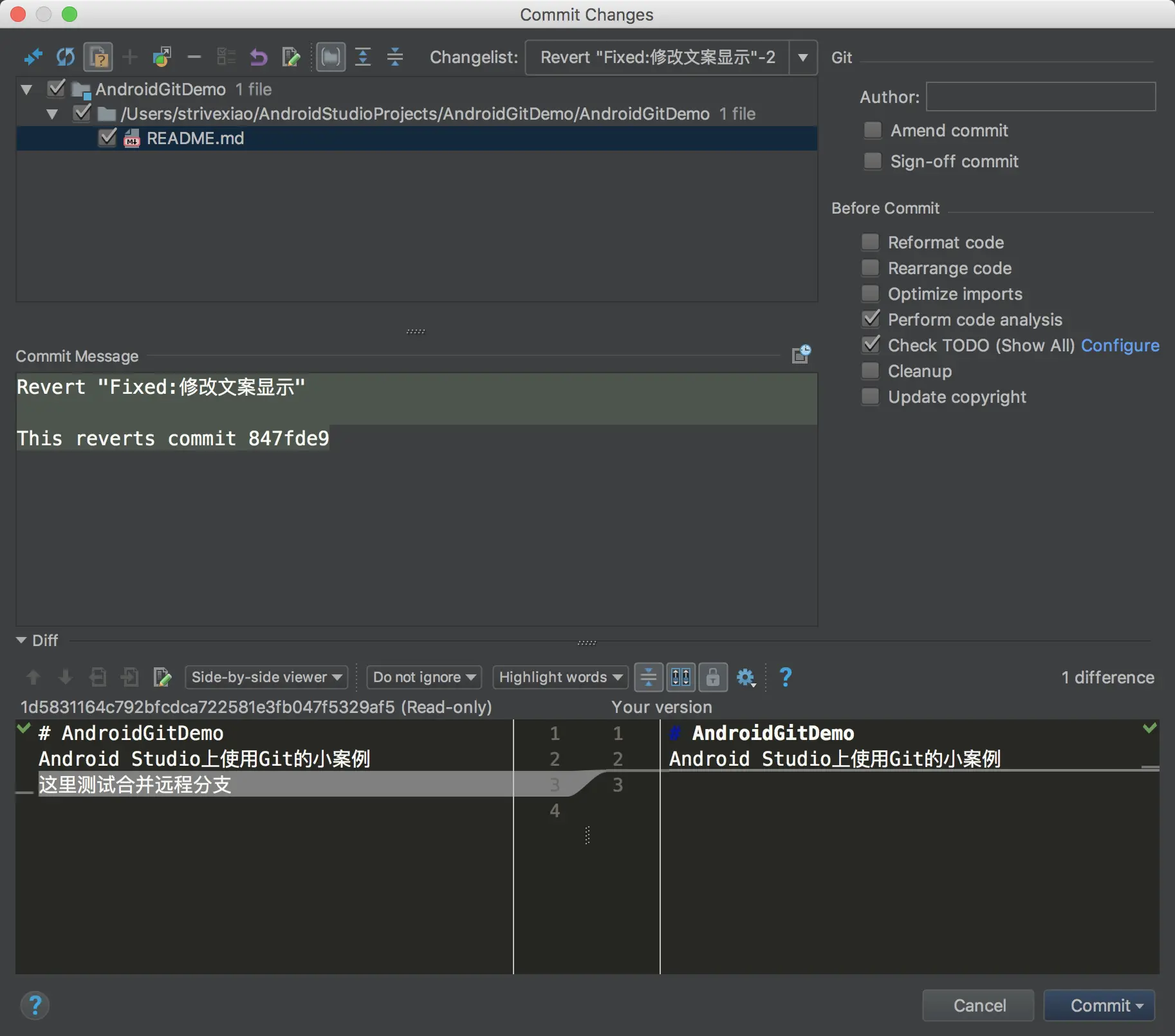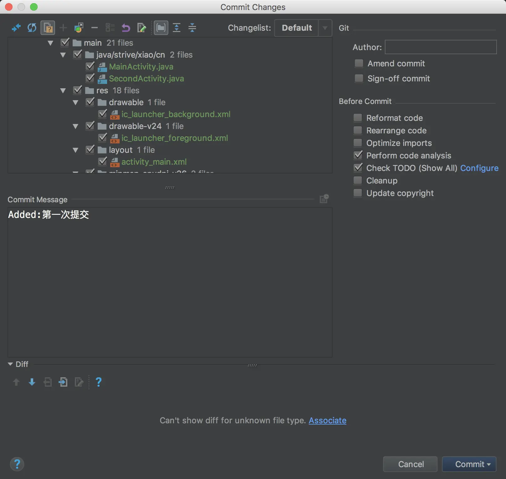 一般情况下,我们clone下来的仓库里都是以前的项目,我们便可以熟悉代码,或者正常开发了,如果是新仓库,我们便可以在此仓库下创建Android项目,创建好之后,我们可以add-->Commint进行提交,再使用快捷键command + shift + k进行Push操作: