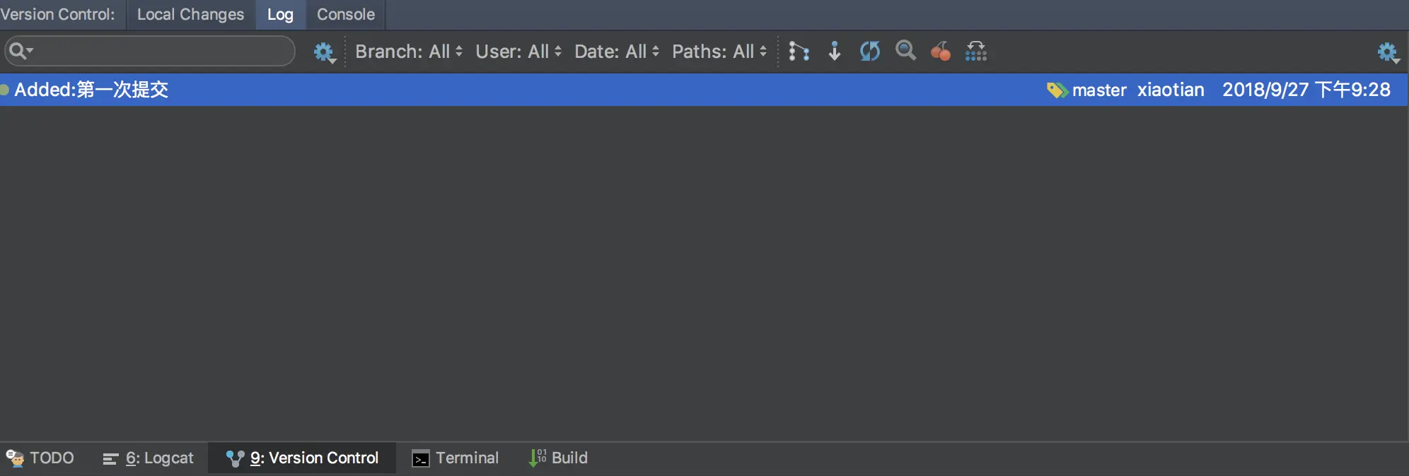 Commit之后,文件名的颜色就会再次变为白色啦,提交成功之后点击咱们AS屏幕下方LogCat旁边的Version Control工具按钮,还可以发现很多便利的操作,像Local Changes可以查看有哪些本地文件发生了改变,Log可以看到这个仓库的提交信息,Console便是控制台,很贴心有木有?对于习惯命令行的童鞋可以直接在这里用git命令进行操作