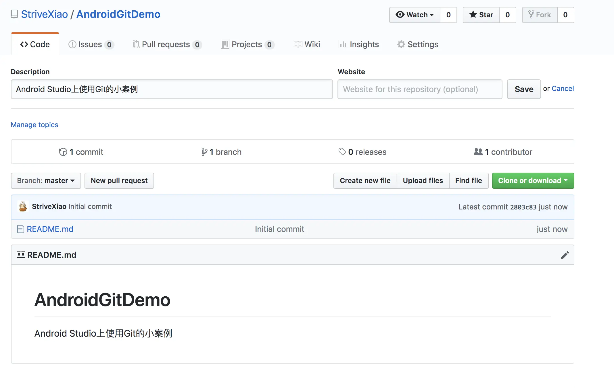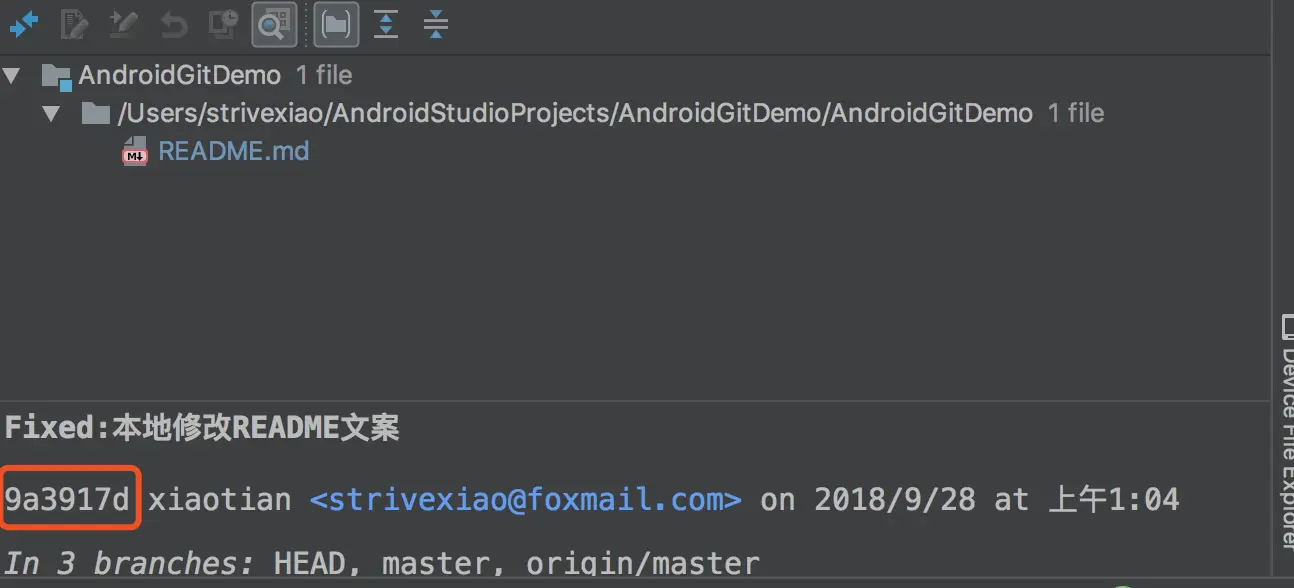 查看都是最简单的,在AS上也是如此,在主界面的右下角显示Git:master就表明当前的分支是master分支,没有创建新分支的情况下,默认便是master分支。