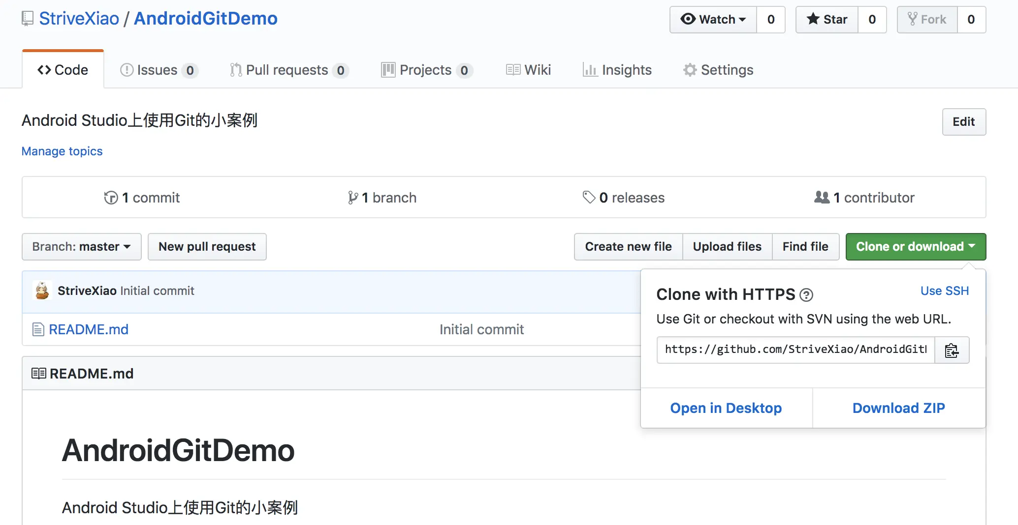 使用Git clone项目到本地是非常简单的,熟悉项目代码的第一步,首先得有项目。在刚才创建好的仓库中,点击Clone or download,再点击地址旁边的那个小书页一样的图标复制地址即可: