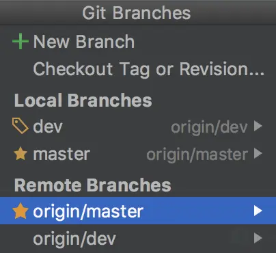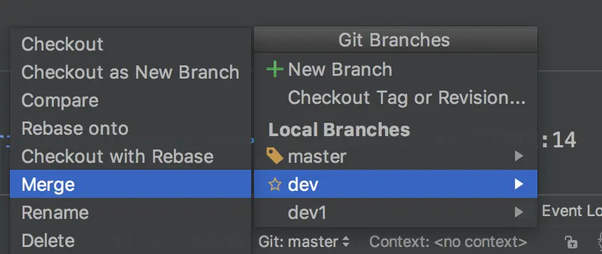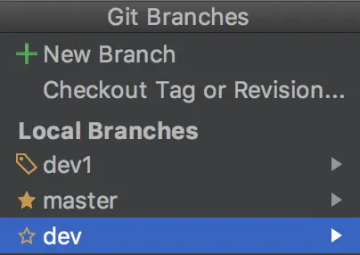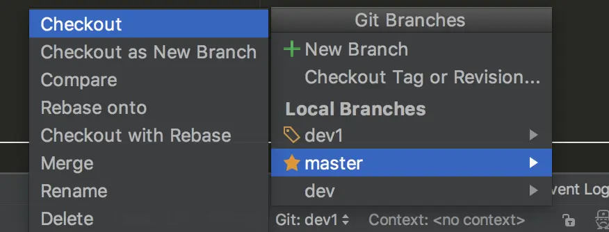 dev,勾选Checkout branch(默认是勾选状态)再点击OK,这样就将dev分支创建好了,并且会处于该分支中,如果有新功能也可以以同样的步骤创建其他分支,可以看到我们现在有三个分支:master、dev、dev1:
