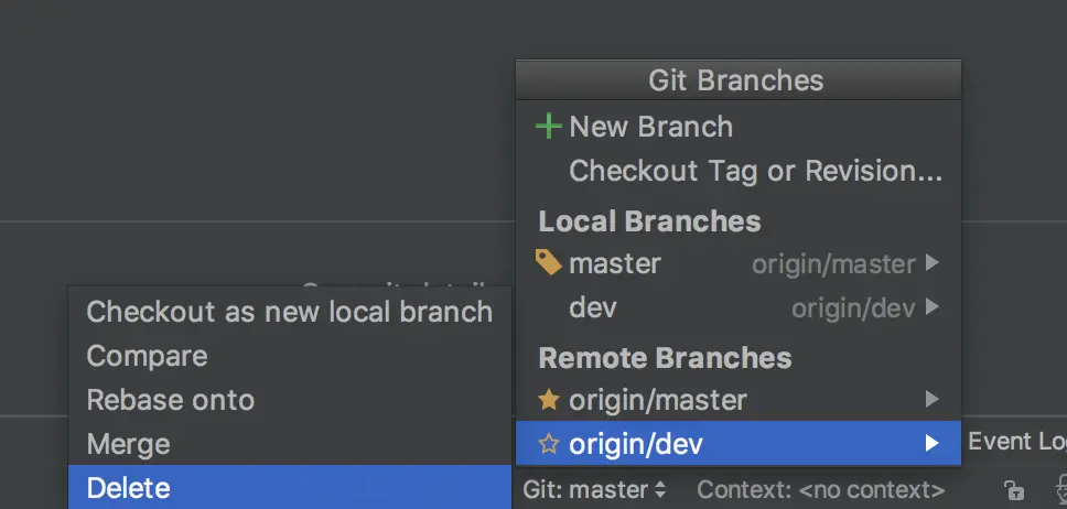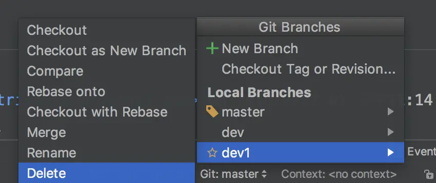 好,我们新功能完成了,Bug也修复了,这时那个分支便不再需要了。为了便于分支管理,我们可以将该分支删掉,如下图,选中dev1分支,点击Delete,拜拜了,您嘞,直接干掉。