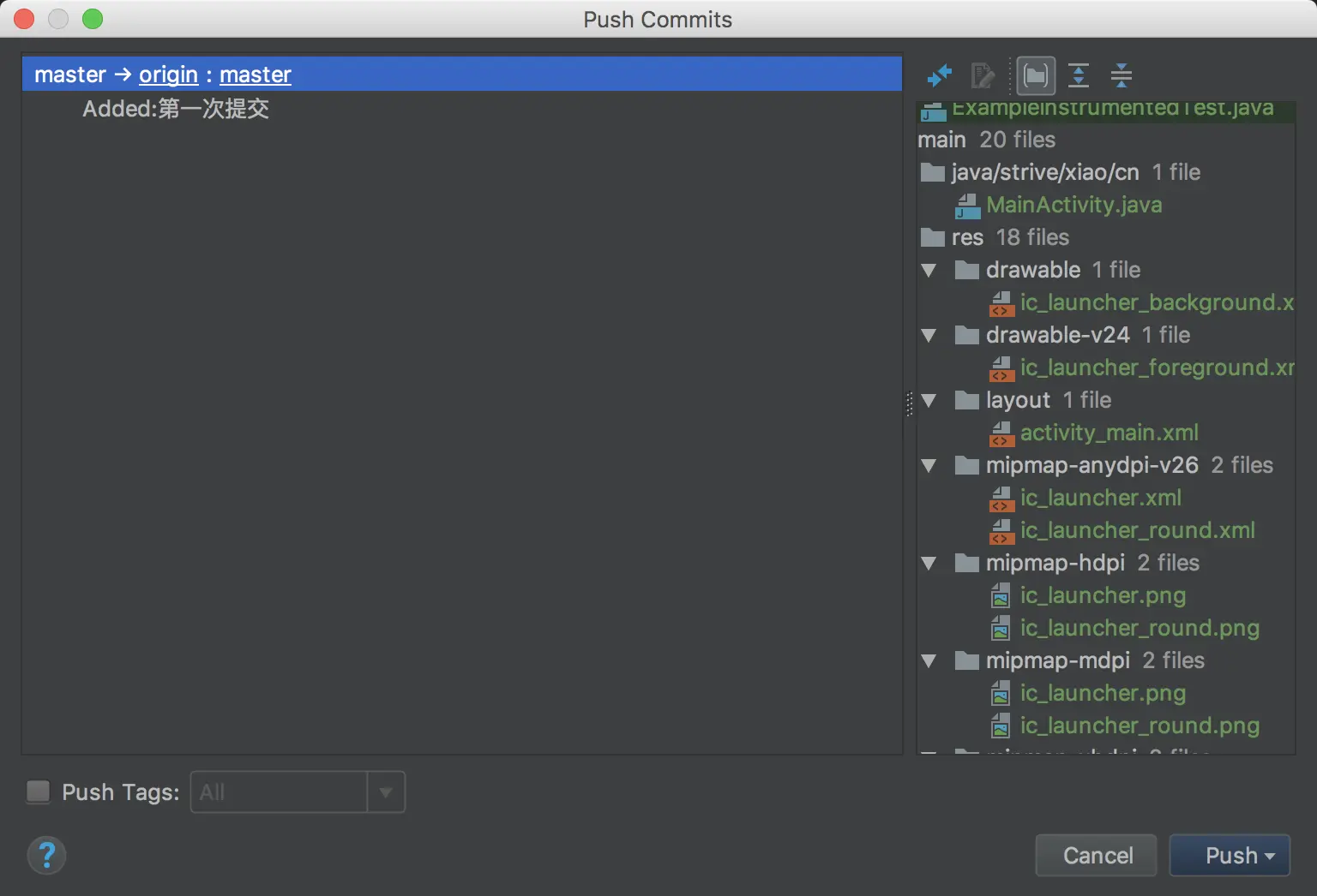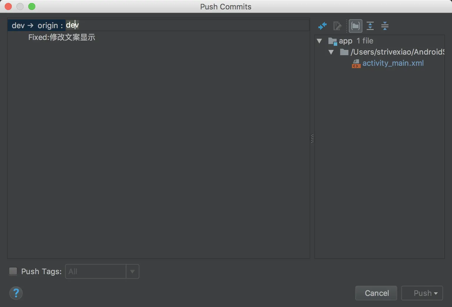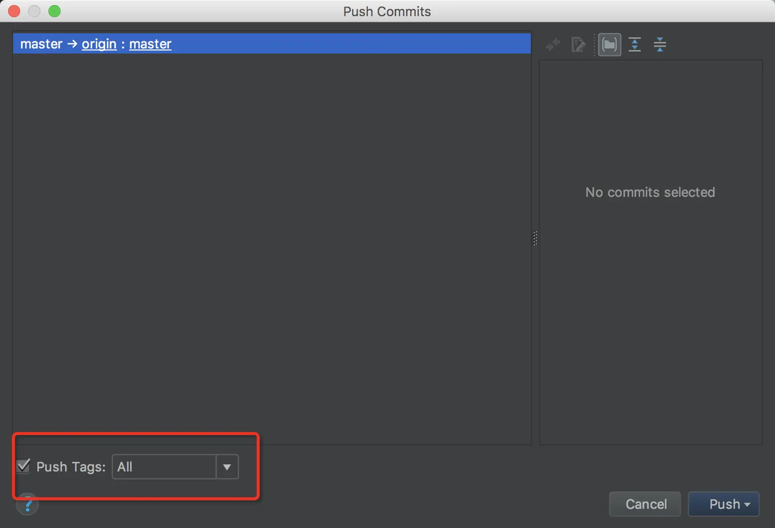 Push,这里要注意,一定要勾选Push Tag,分支选择All或者Current Branch都行的,根据需求来。
