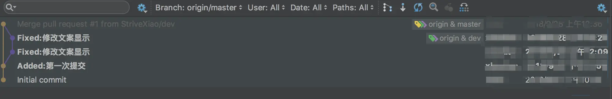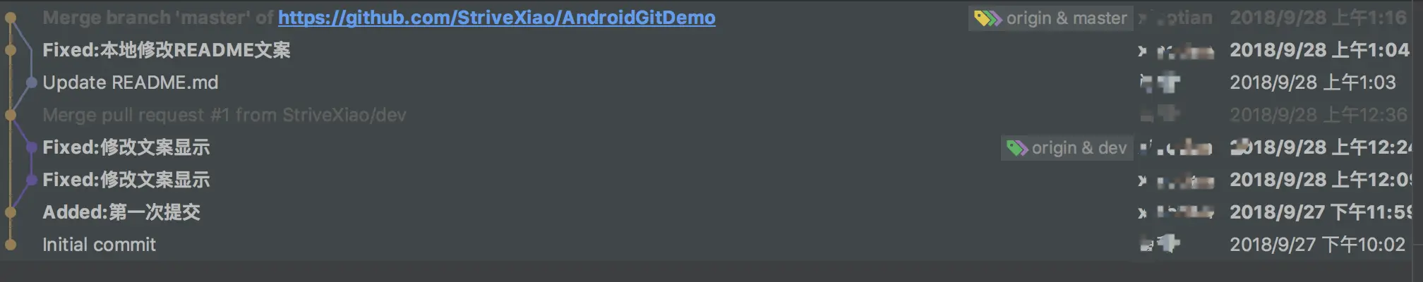 Commit-->Push完成之前的操作。查看Log也可以看到每次的合并日志: