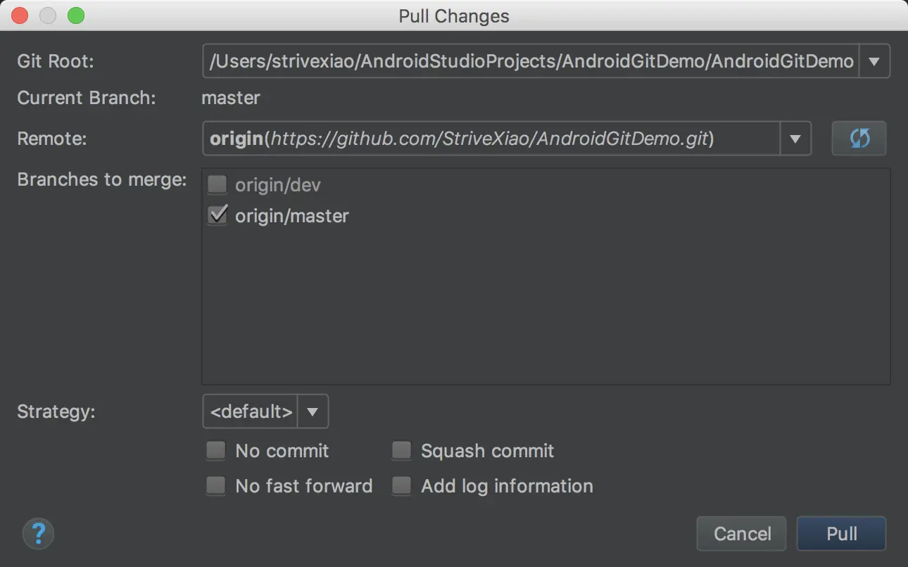 在开发中,同一个项目一般是团队一起开发的,所以我们也要养成好的习惯,Commit之后,在Push之前我们要习惯性的Pull一下代码:点击菜单栏的VCS-->Git-->Pull,点击刷新按钮之后再选择所要Pull的远程仓库: