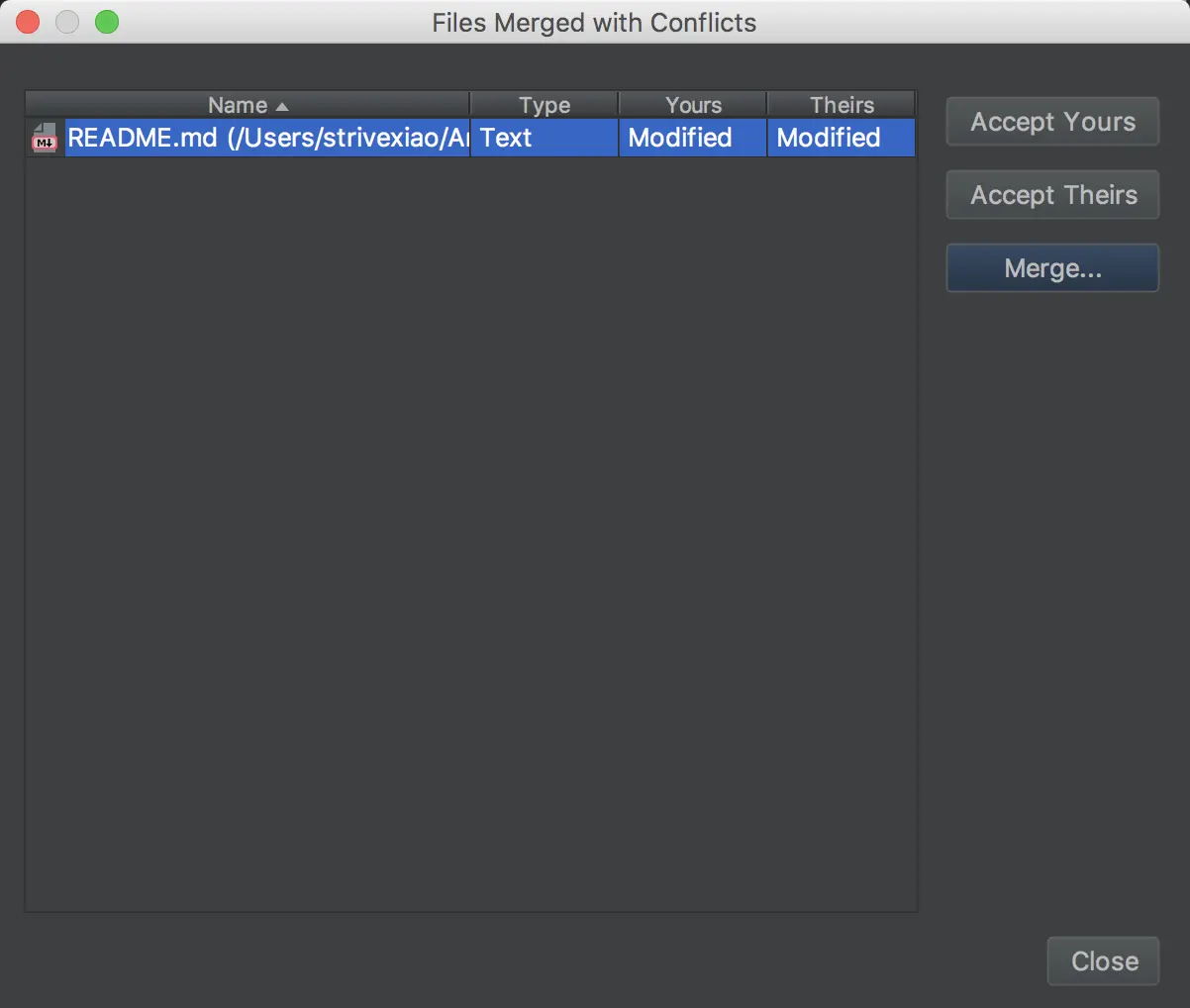 冲突嘛,在所难免的,基本上每天或者定期选一个时间和同事一起进行代码的合并是最好的啦,可以一定程度上避免问题出现,这里演示一下,在AS上我们怎么解决冲突,同时修改 REDEME.md 。在Pull的时候发现冲突: