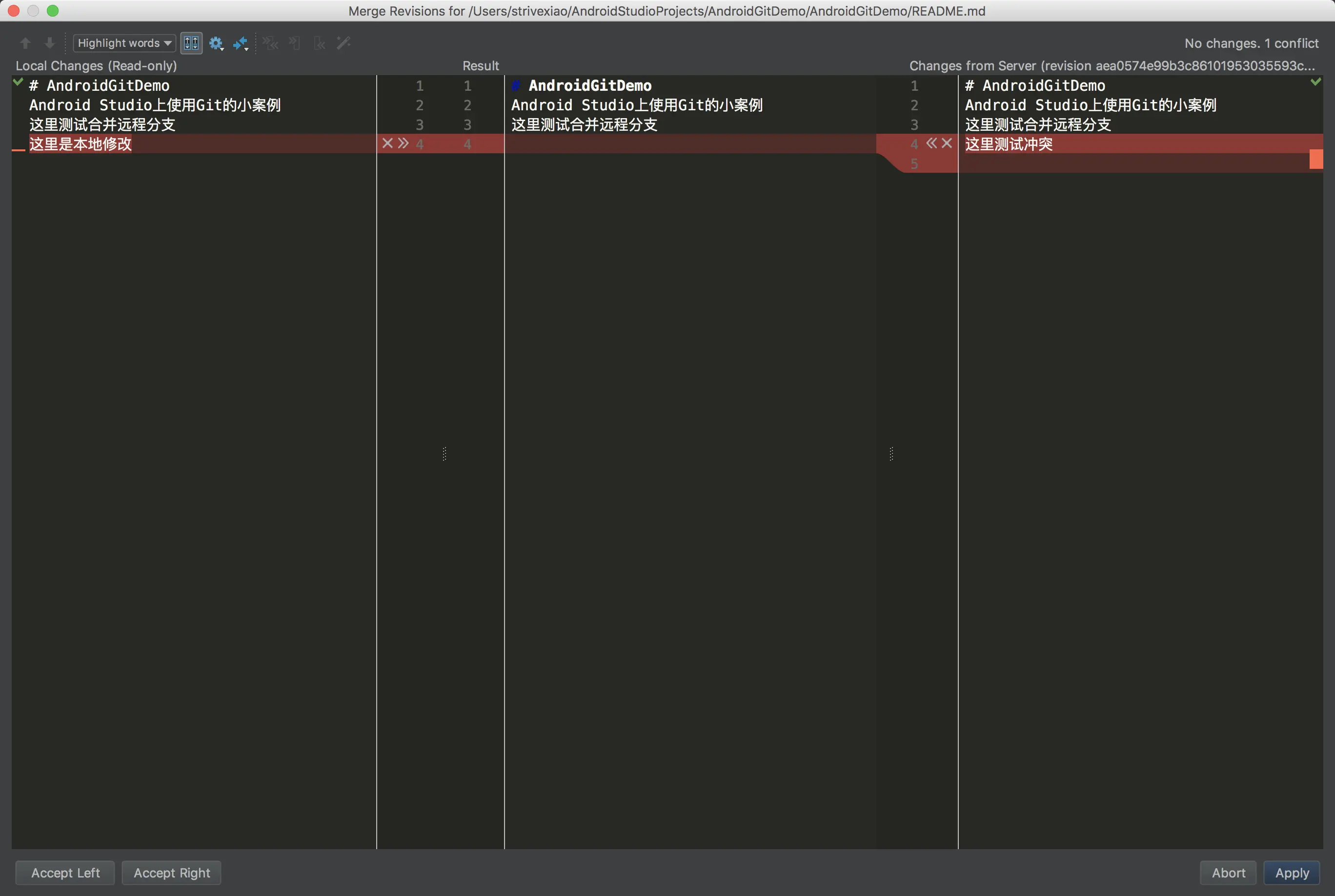 X和>>符号,点击X表示不需要这一行的修改,点击>>表示接受这一行的修改。我们也可以像在编辑器中那样复制、粘贴、编辑内容,解决之后可以点击Apply进行保存,如果你不想保存,那就点击Abort终止此次修改。这里咱们都要(小孩子才做选择,我是成年人,我都要,哼),然后再运行项目,看是否有问题,如果确保没有问题了就可以再次