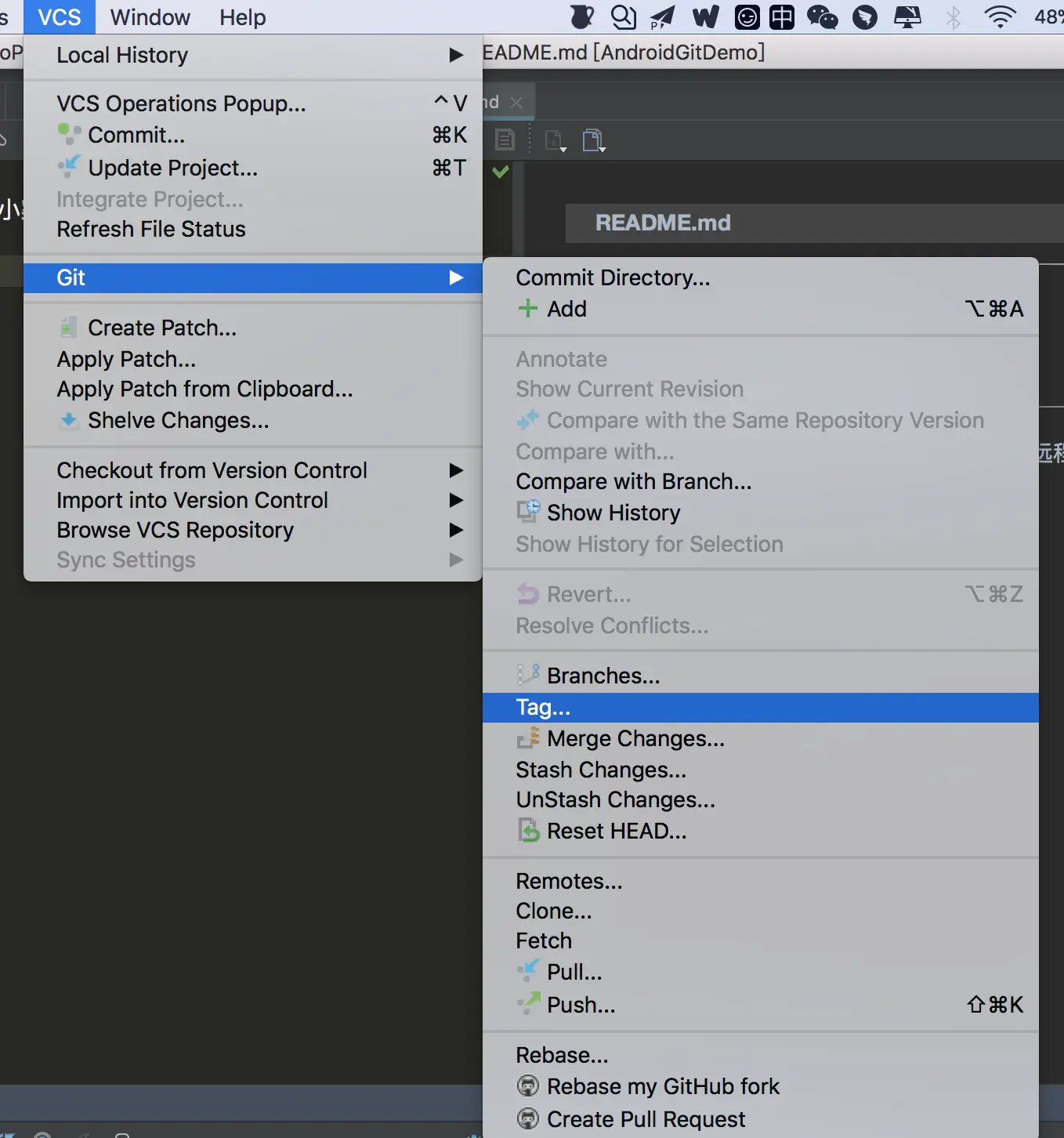 打Tag前肯定要将代码提交到远程仓库上,正常操作之后,我们继续VCS-->Git-->Tag: