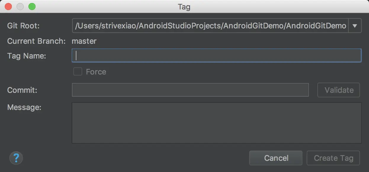 Validate可以查看指定提交记录的变动。Message里是描述这个Tag信息的。最后都填好后,点击