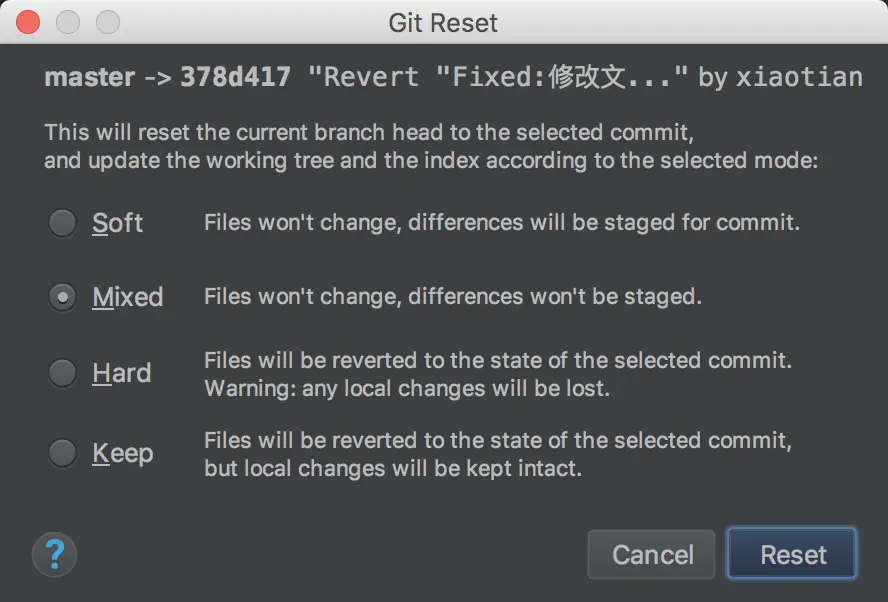 Soft:文件内容不会变化,之前提交记录的修改还是在暂存区,可以直接再提交一次。Mixed:文件内容不会变化,之前提交记录的修改不在暂存区,需要添加到暂存区才能提交。Hard:文件会回滚到我们选定的提交记录的代码状态,之前提交记录的修改和还没来得及提交的修改都会丢失。Keep:文件会回滚到我们选定的提交记录的代码状态,之前提交记录的修改会丢失,但还没来得及的提交的修改可以储藏(Stash)起来,待重置之后反储藏(Unstash)恢复。