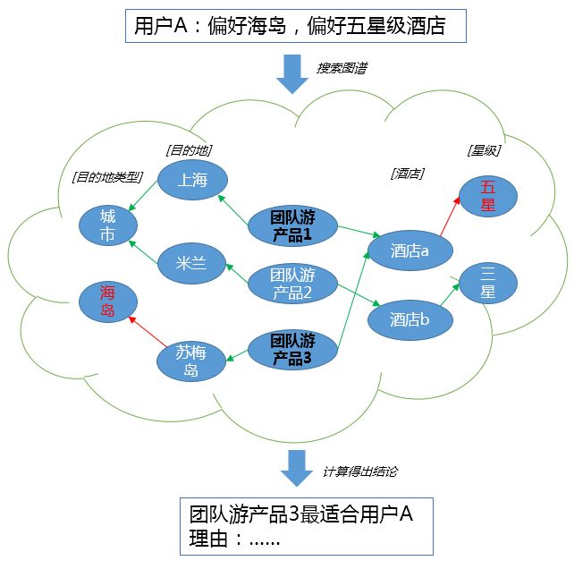 如上图所示,当我们通过数据挖掘发现用户A的兴趣点是海岛和五星级酒店后,我们可以通过知识图谱关联出相关的团队游产品。知识图谱提供的信息可以作为推荐系统的一个重要维度,参与下一步的计算,为精准推荐增加一块砝码。